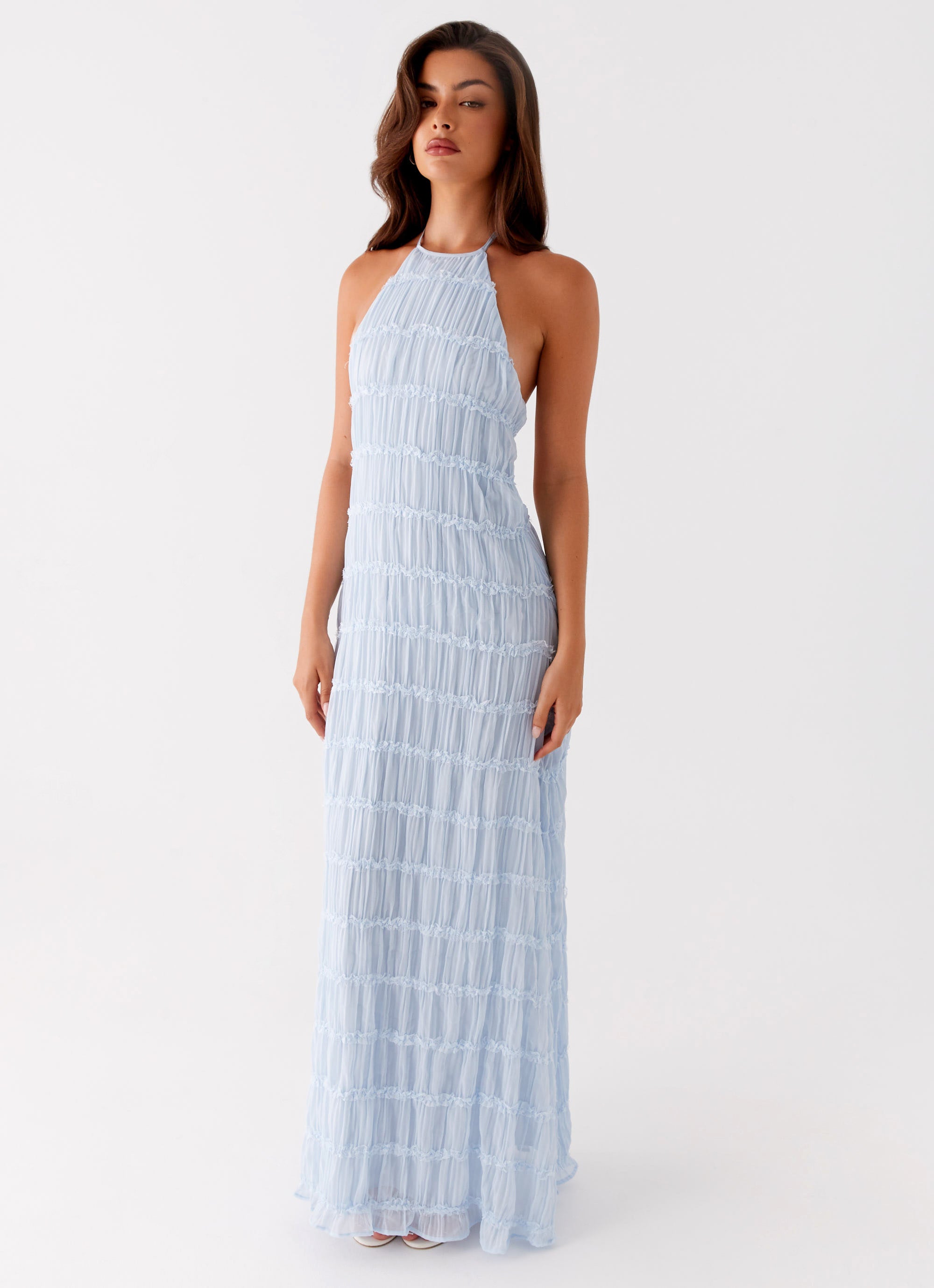 The Aullie Maxi Dress is made for golden hour gatherings and balmy nights that call for effortless sophistication. Featuring a stunning halter neckline with a chic neck tie. this silhouette is elevated by delicate lace detailing and a textured finish. Designed with adjustable back straps and a flowing maxi length. it's a feminine statement piece crafted for sunset-to-sundown elegance.