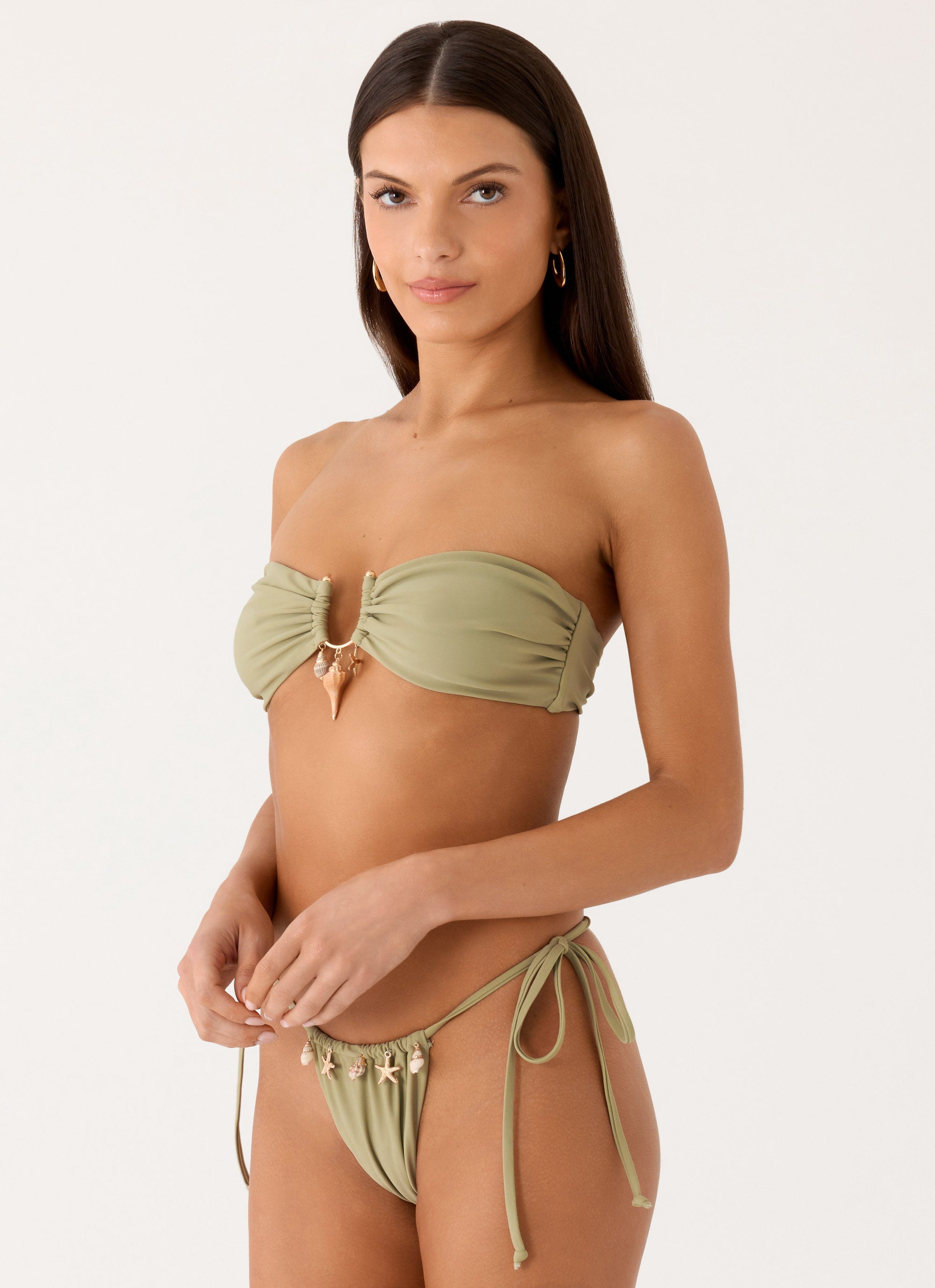 The Corali Bikini Bottoms are made for sun-soaked days that shimmer into golden hour. Featuring tie sides. a ruched waistband. and shell hardware detail. they sculpt a flattering silhouette while being fully lined for comfort and playful. editorial summer style.