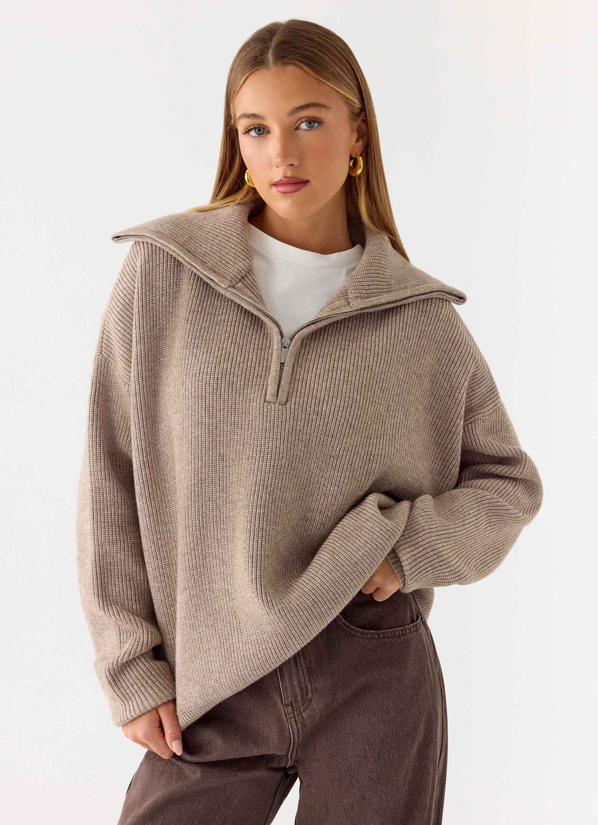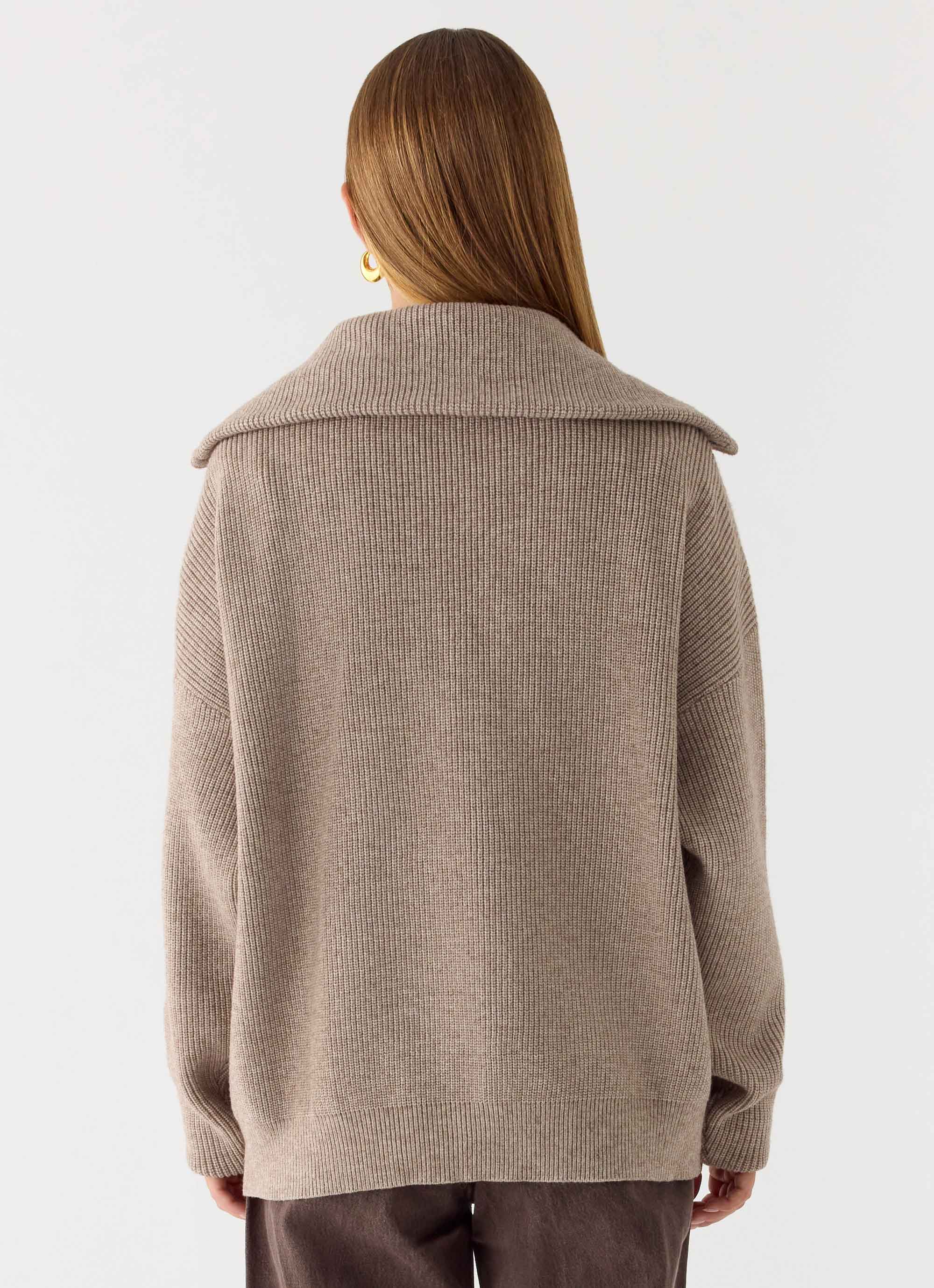 The Eirena Quarter Zip Knit Sweater is made for slow mornings that ease into cool nights. Designed with a half zip front and relaxed drop shoulders. this oversized silhouette is crafted in a thick knit for effortless layering. It's the perfect off-duty piece for cozy escapes and elevated everyday styling.