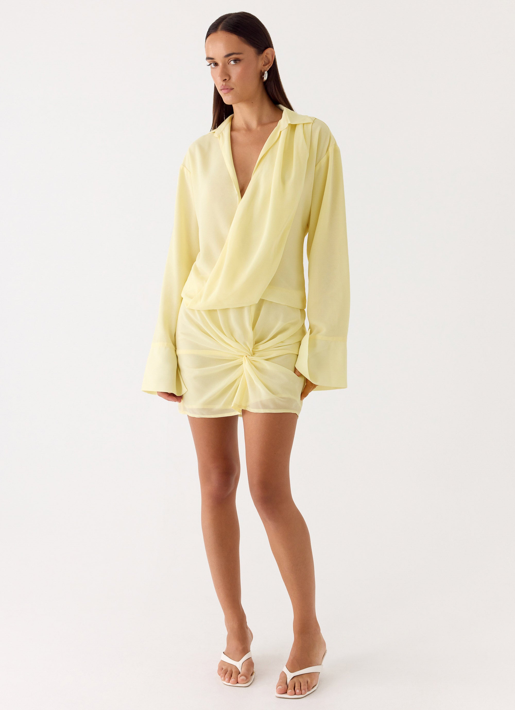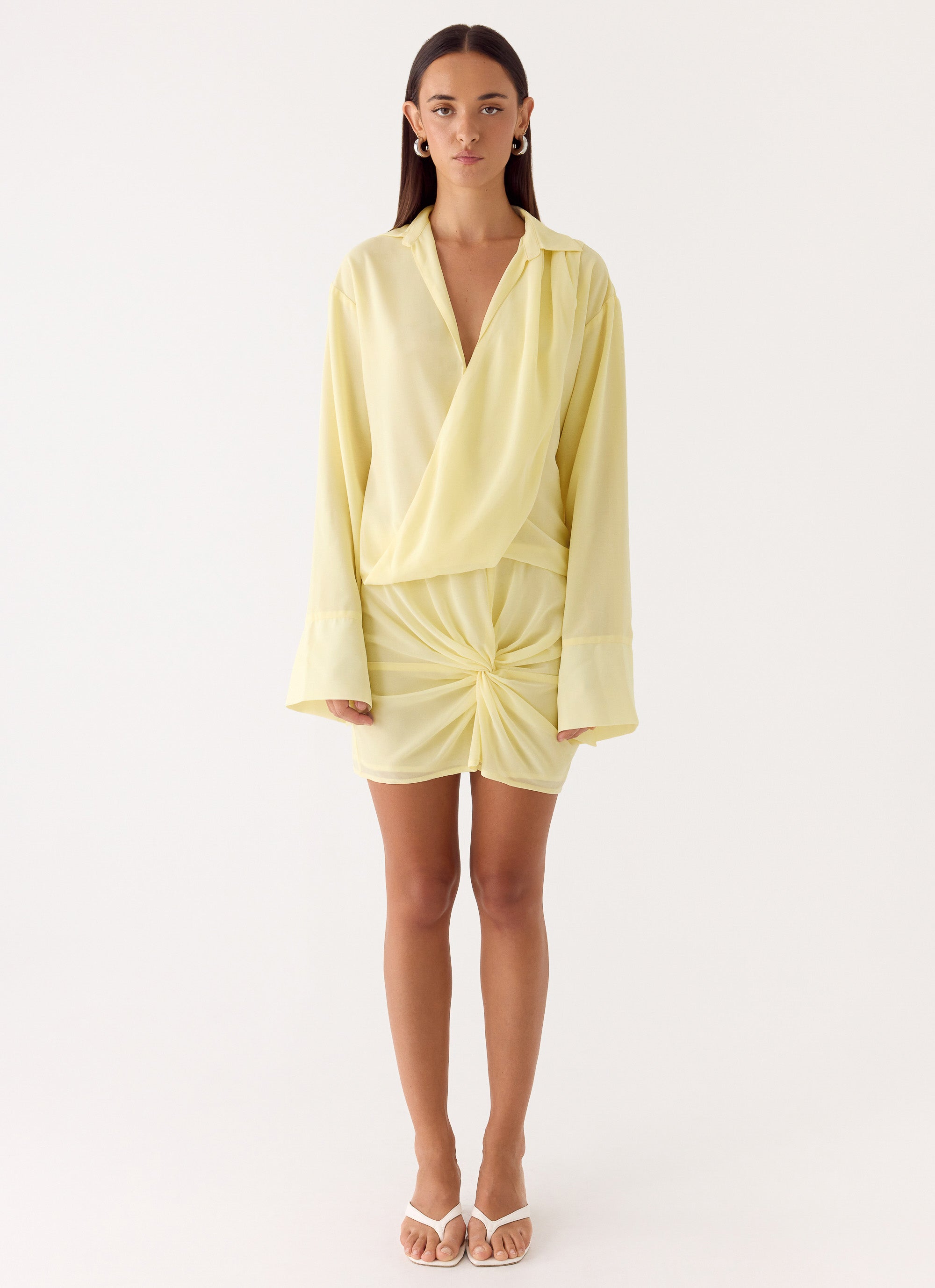 The Farretti Shirt Mini Dress is made for twilight moments that linger into the night. Designed with a wrap-style bodice and mini-length silhouette. it features a flattering V neckline and a softly twisted skirt detail that adds movement and shape. Finished with flared long sleeves and tailored shirting accents. it balances polished ease with after-dark allure.