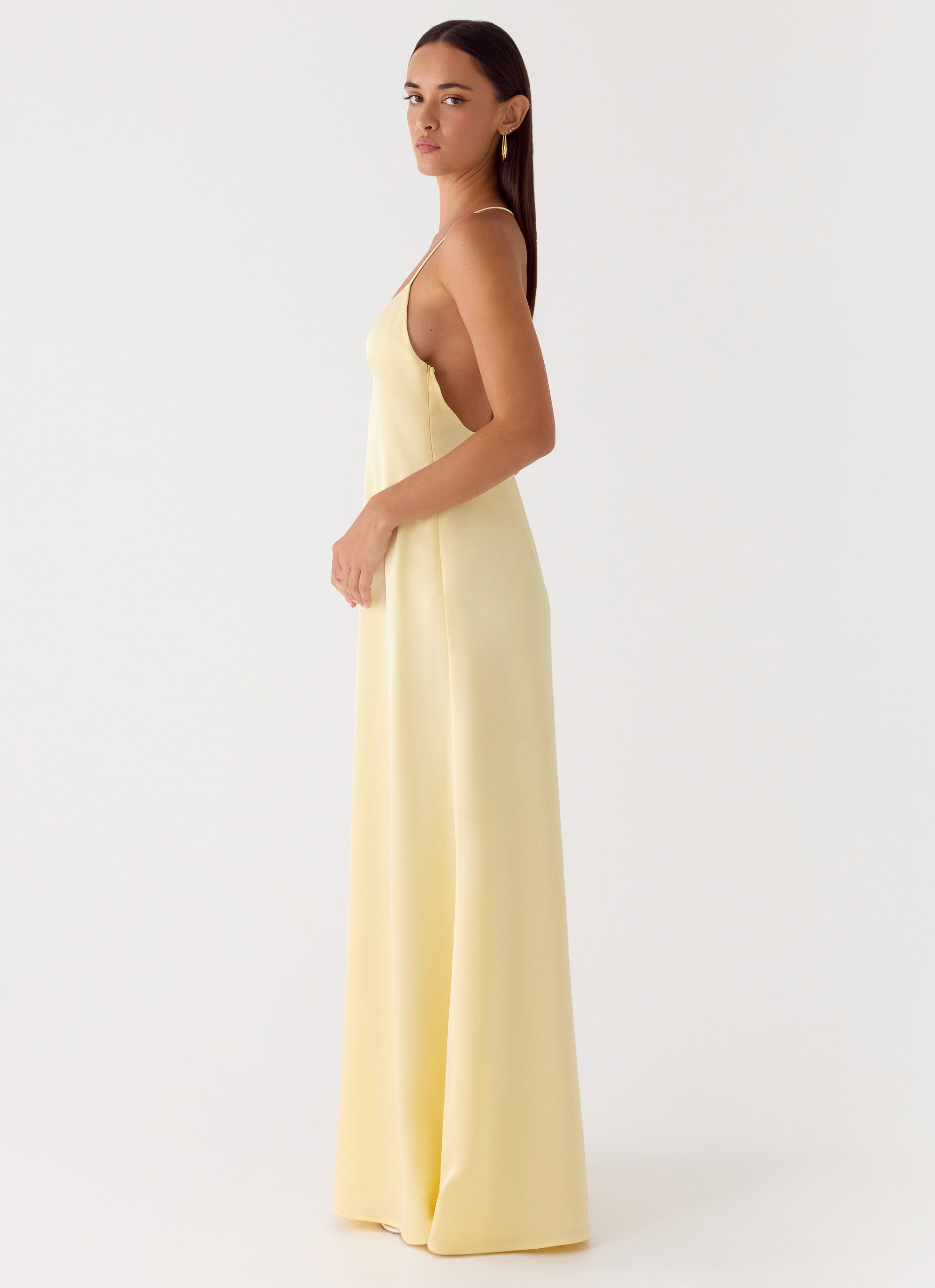 The Fine Line Maxi Dress is made for evenings that glow long after sunset. Cut in a fluid satin composition. this sleek silhouette features a flattering V front and delicate thin adjustable straps. Fully lined for a smooth finish. it falls into a sweeping maxi length that moves effortlessly with every step — understated. feminine. and ready for the after-dark.